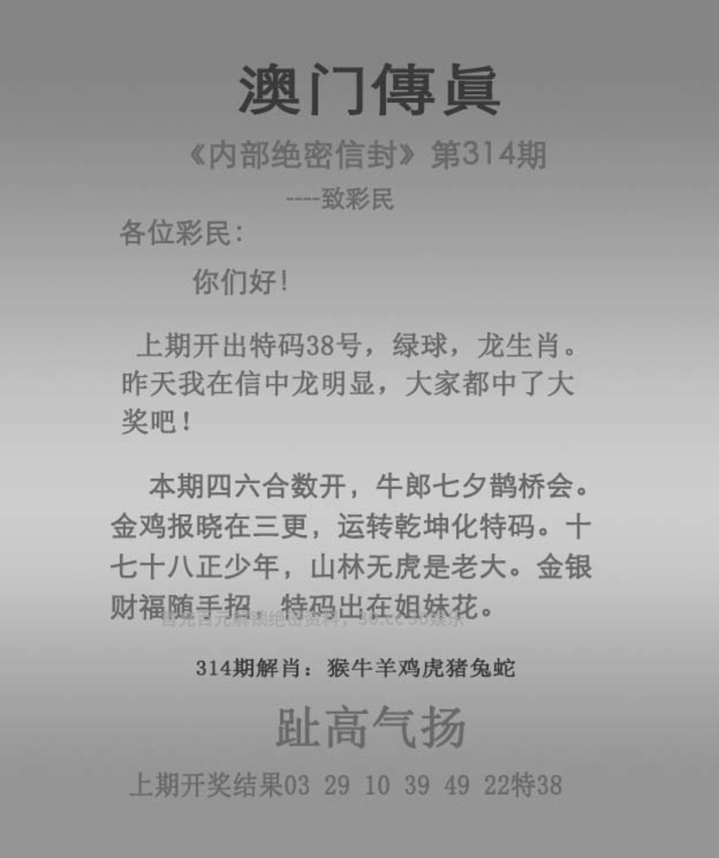| 315期:独解传真 解:今期生肖一八开,穿金戴银戴兰花。今期特尾二三七,三八三九还要防。风流才子俏佳人,玄机道破点三二。买了一六出二九,森林之中它为王。 送:鼠羊牛虎龙马猴狗 |